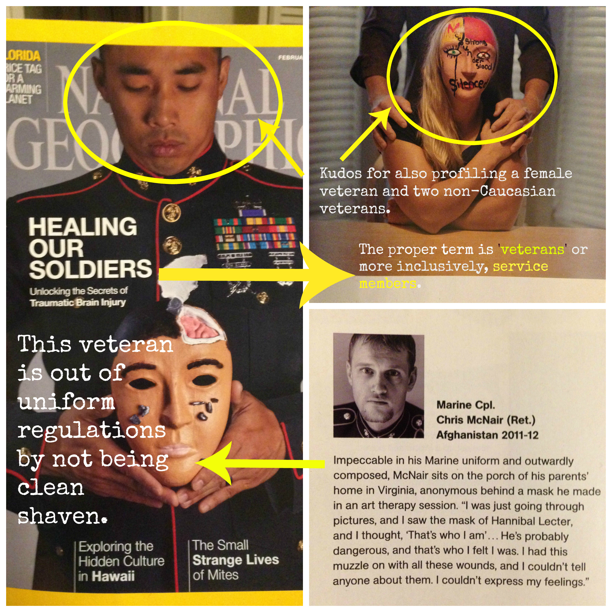 An organization such as National Geographic should be well aware that we are not all soldiers, especially when it takes the time to portray a Marine on the cover. The generic term of ‘soldiers’ is an antiquated way to look at veterans and service members as a homogenous group. We are not all soldiers. I, in particular, get ticked when people call me a soldier. I am a Marine. I earned my title of Marine. I don’t make this statement to downgrade a Soldier’s service. He or she worked to become a Soldier. I worked to become a Marine.