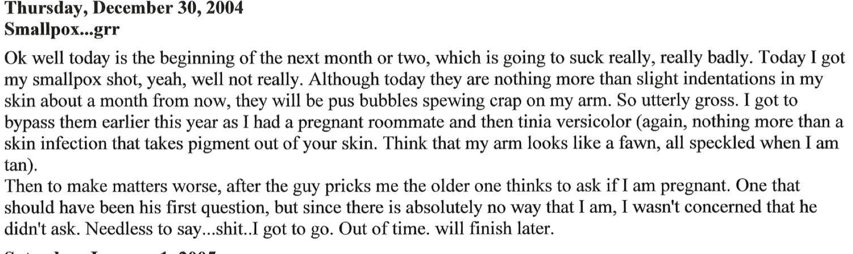 My voice is recovering. I have laryngitis so it might take a week to fully sound like myself again,but it’s nice to know I’m not contagious. I went back to work today and had class. I’m not the kind of person who typically takes sick days. Call it a bad habit from my Marine Corps service, but I am used to working through pretty much anything. We [recruits, in general] get what’s dubbed the recruit crud; oddly enough, as I was looking for an explanation of it for you all, I came across this article from the Navy’s website. I can’t recall ever getting the flu when I served. I even had the misfortune of getting my smallpox vaccine in Iraq because the girl who was designated my roommate stateside came to Camp Pendleton pregnant from MOS (military occupational specialty) school. Yes, I wasn’t allowed to get my smallpox vaccine pre-deployment because she was pregnant. And in case you get the smallpox vaccine during pregnancy or inadvertently become pregnant, you can check http://www.smallpox.mil/event/pregnancy.asp.