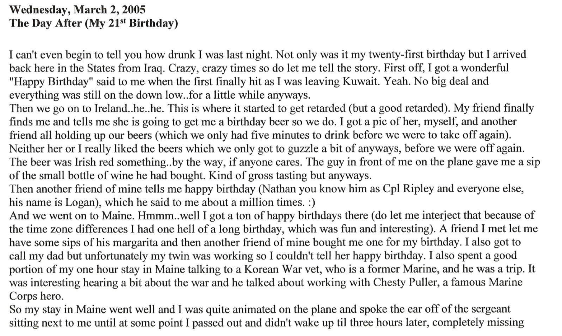 I didn’t write a journal entry that day but I wrote about how wonderful my homecoming experience was thanks to the Marines I traveled home with, the veterans who greeted us in Bangor, Maine and my work crew at 1st Marine Division: