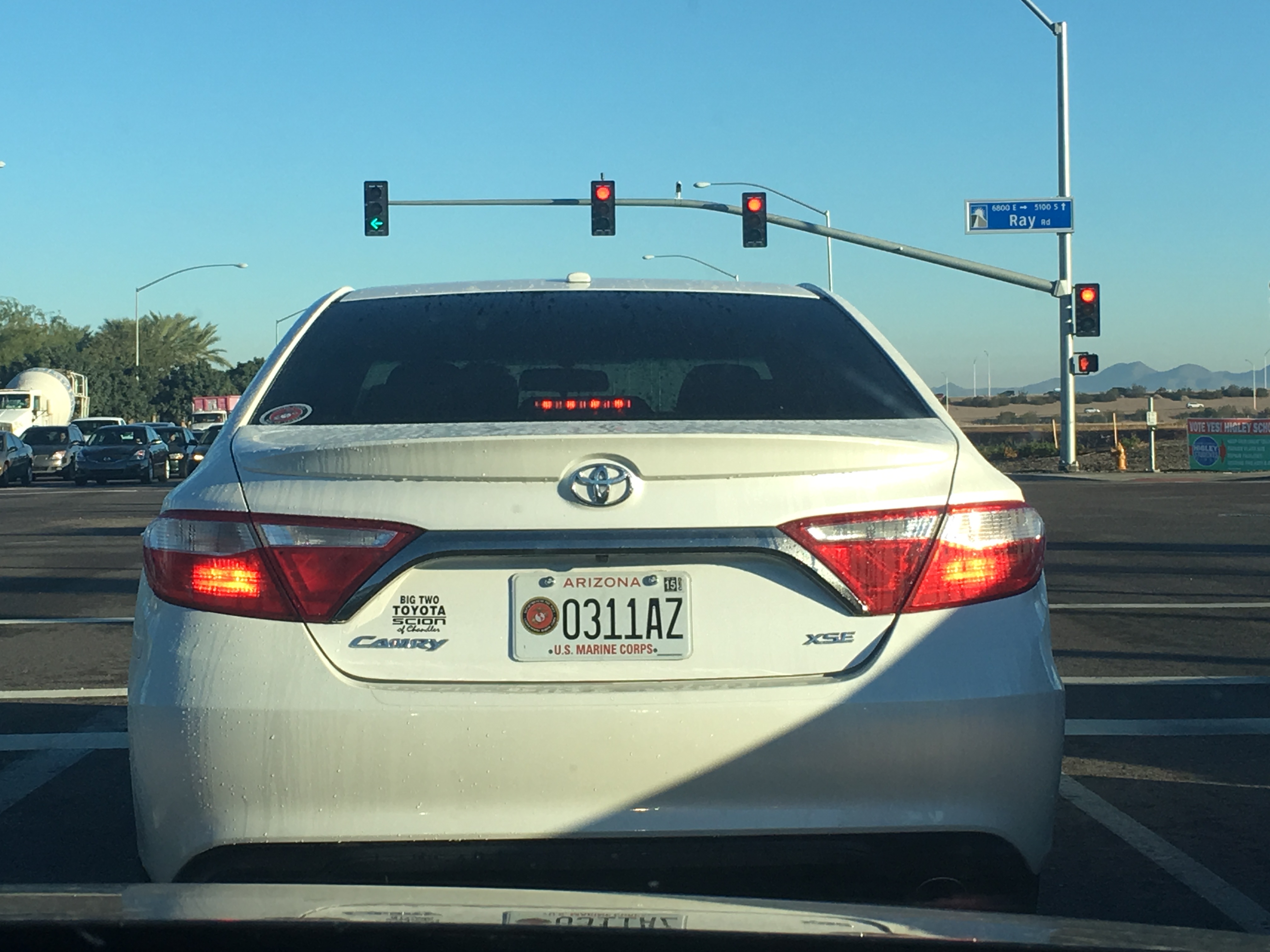 And it’s not like the motivation completely ceases once one leaves the Corps. Some Marine veterans might attend a friend’s unit’s birthday ball as guests or go to a local Marine veteran organization for similar festivitites. Earlier this year, Marine Corps license plates became available in Arizona. I had the pleasure of seeing one such plate earlier this week. $17 from the fee for this specialty plate goes to the Marine Corps Scholarship Foundation.