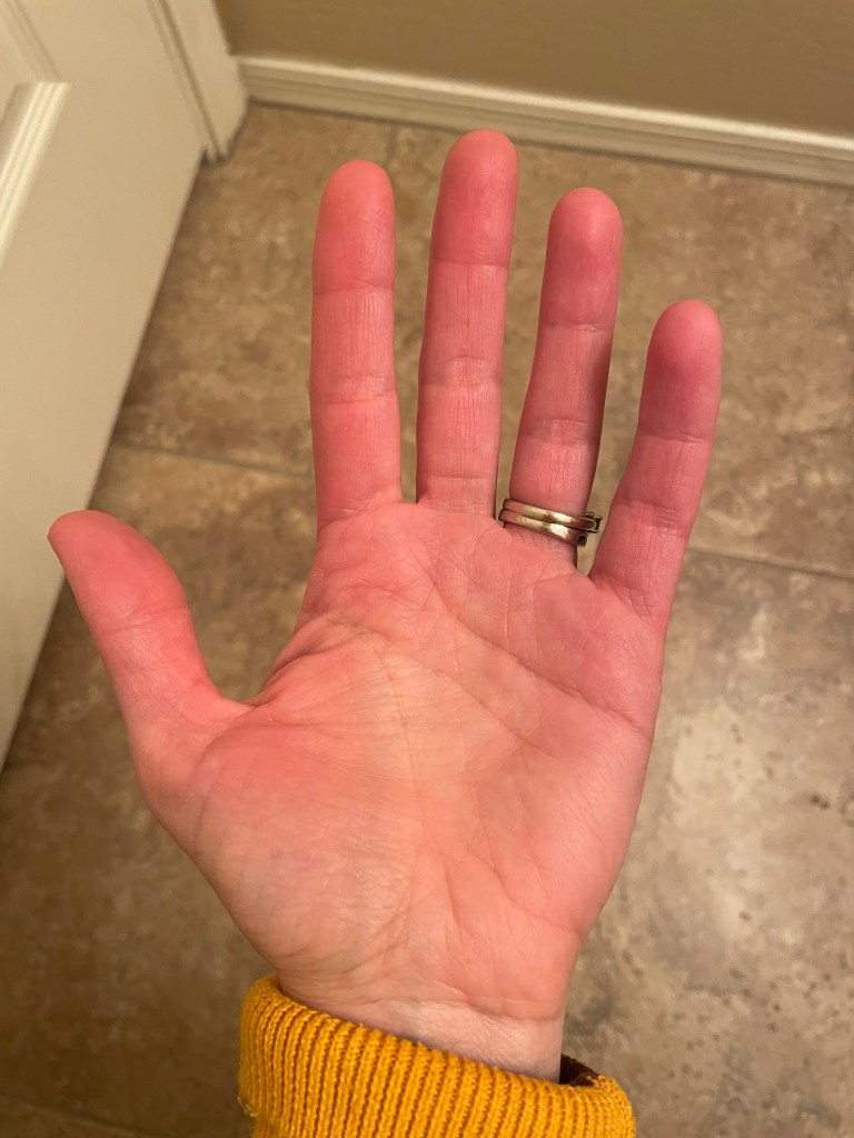 Developing edema last year and seeing the expenses related to that ER visit played a role in using private health care as little as possible. The timing of the visit made it less terrible than it could have been. I paid $200 or so out-of-pocket that evening and later saw that the total visit was about $5,000 sent to my healthcare company. We’d met our deductible, so things were ok financially but not all families are so lucky, especially if their medical needs have higher regular costs to manage them. My problems pale in comparison to theirs. The edema is a consistent issue and varies by day, but throughout the year, I developed nerve issues that started in my feet, moved up my leg, and after switching my exercise routine to pilates to manage my leg issues, I soon started exercising nerve issues in both arms. Since nerve issues are one of those invisible health conditions that are hard to demonstrate, I wanted to share with you all the swelling and redness that developed in my hands over the past few months.
