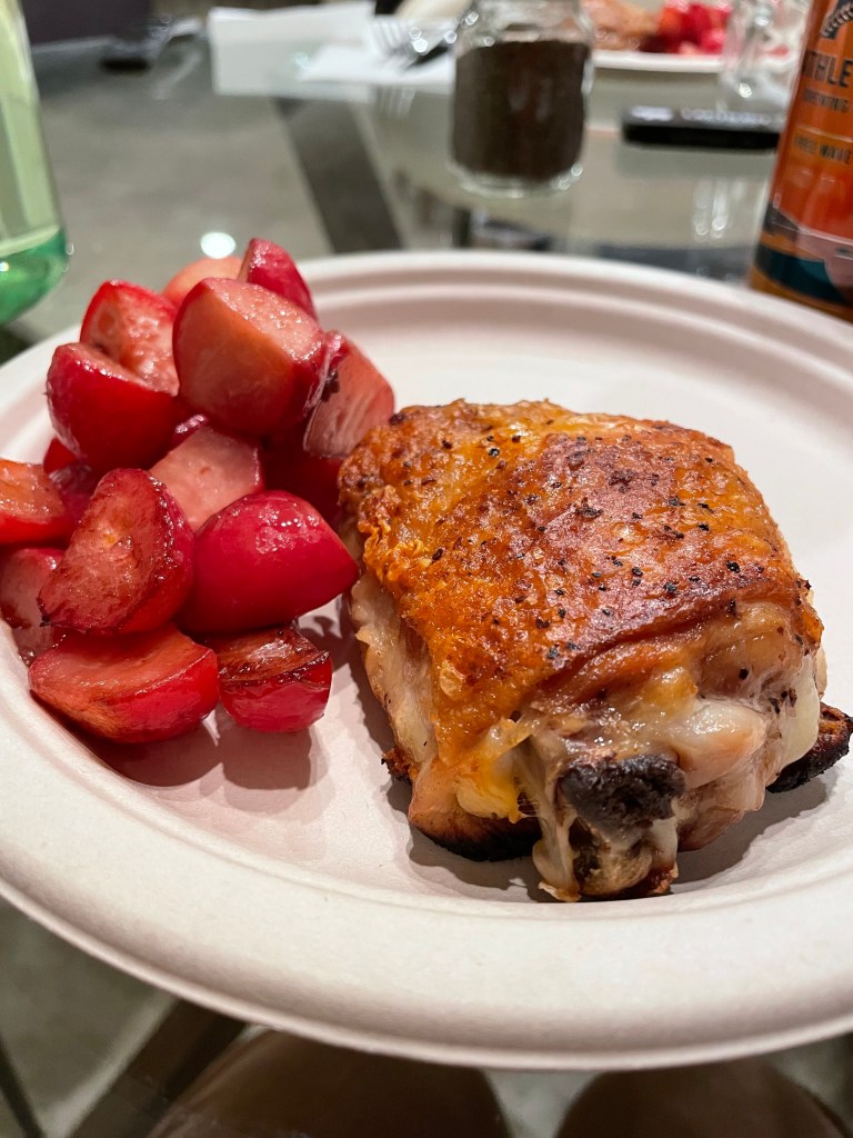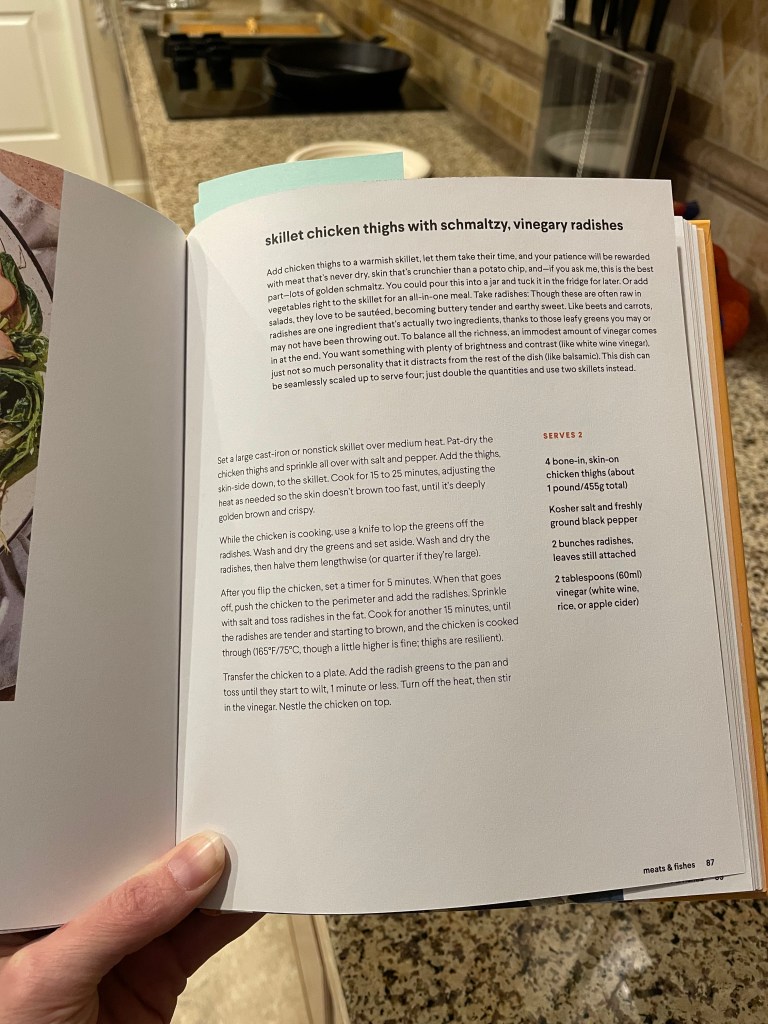 I picked up Food 52’s Big Little Recipes by Emma Laperruque from the public library and the pared back recipes have been a blessing. This week I will make the smash-fried potato salad with sweet pickles and red onion, pork meatloaf with cabbage slaw, and asparagus and cashews with green polenta. Here is one of the previous recipes I made. I could not fit everything into the cast iron skillet I have. Instead, I had to spoon some of the schmaltz into a measuring cup and add it to a second skillet to roast the radishes. My store did not have radishes with greens still attached, so the results varied. I would recommend if you’re in the same boat you can pair with a green salad.