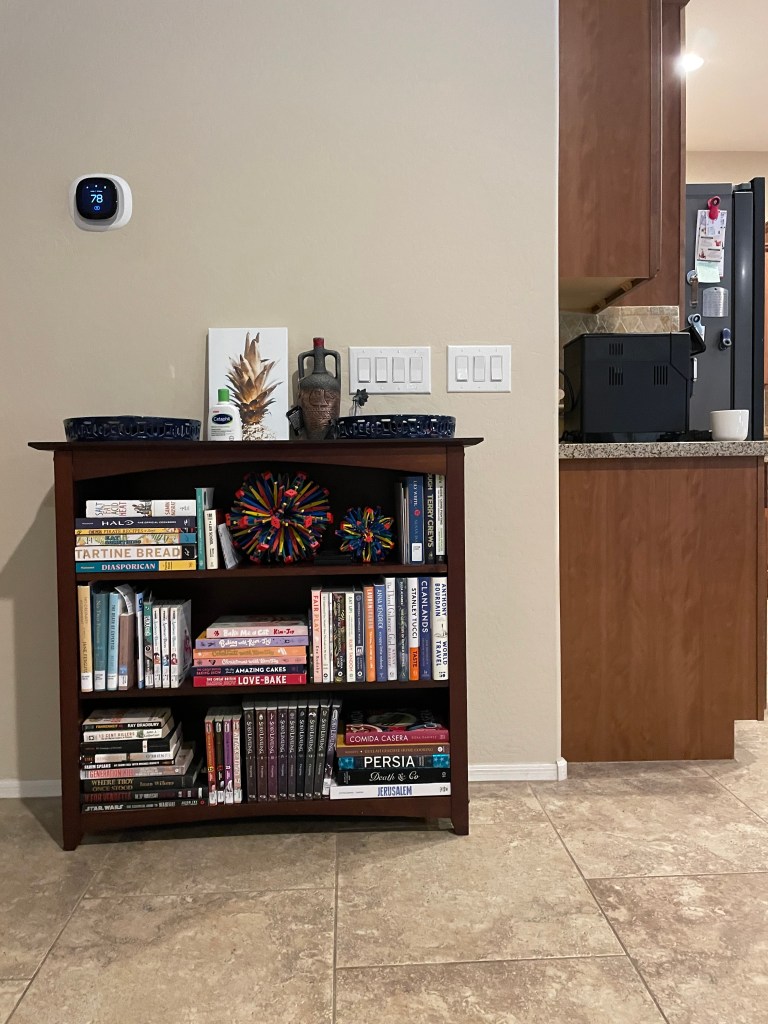 My family bookshelf includes cookbooks, a mixture of fiction and non-fiction works, and a rotation of library books.