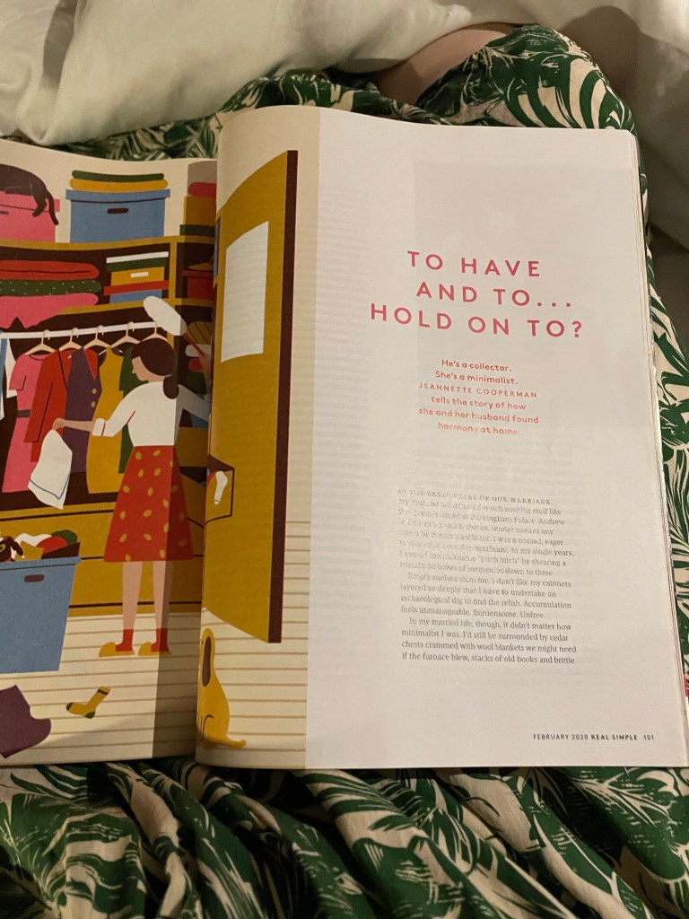 My family and I recently completed a relaxing staycation in Phoenix and I loved that the rental home had several back copies of Real Simple magazine (along with several others publications like Dwell and Good Housekeeping). It is rare for me to buy magazines now because they are often so chock full of advertisements instead of useful content. This reality is why I will often pop onto the businesses’ websites instead to jump straight to the content I want to find. I selectively picked up this February 2020 copy, knowing that I had some decluttering I wanted to do in our current home.