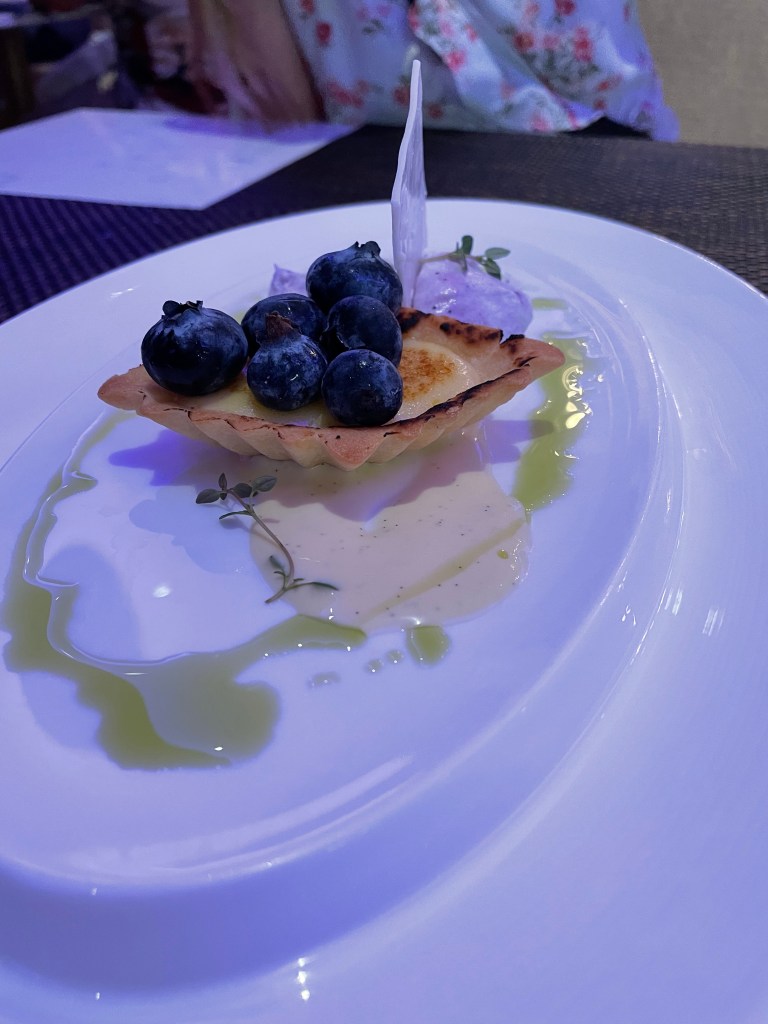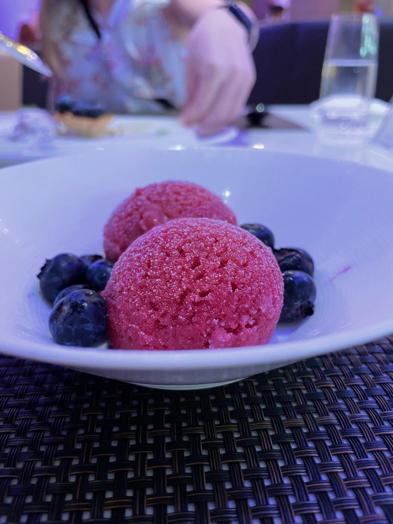 Hamachi Cuido (The harissa puree is harissa, piquillo peppers, lime juice, and vegetable stock.)Braised Short RibLemon Souffle Tart shared by my husband and daughter.I opted for the seasonal fruit sorbet as I forgot to bring my lactase enzyme tablets to dinner.