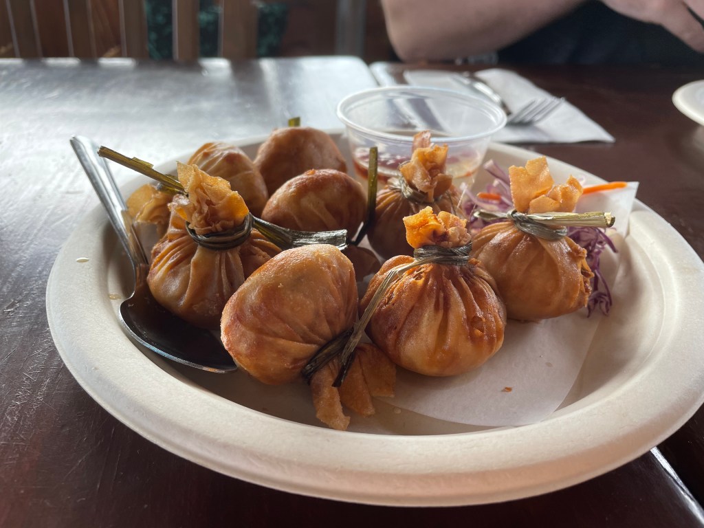 There are times when we travel that I wish I was a travel show host. Seeing all the different options on the menu made it hard to decide and it would have been nice if someone else would foot the bill for some extra options. I’m far too indecisive. We shared the golden bags as our appetizer; these are filled with ground chicken and shrimp. The fried catfish dish my husband ordered was amazing, but rather spicy and the size and quality of the pork fried rice our daughter ordered was better than any other place I’ve ordered the dish. I’ve never cared much for papaya, but I went ahead and ordered the papaya salad as another way of preparation to hopefully overcome my aversion to the fruit. The green papaya, from this experience, is more enjoyable than when enjoying the fully ripened fruit. Before the trip, the only way I found I really liked papaya was when it is dried but it’s always bothered me how hard it can be to find it dried and not covered in sugar.
