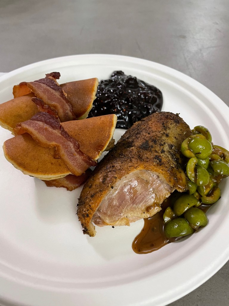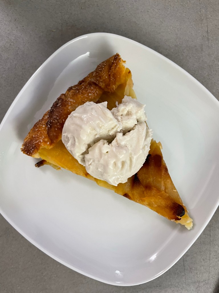 Our choice to have a bacon and egg soup for lunch is something I am happy we opted to go with during our day. We baked the green bean bites in our countertop oven on its air fryer seating and ate them as an appetizer while we pulled the soup together. (The recipe hails from homemakershabitat and we tailored it to our tastes by adding Trader Joe’s Mushroom & Company Multipurpose Umami seasoning blend and soy sauce.)We ate our dinner rather late in the day (totally unplanned); we got caught up in a conversation with some neighbors and were trying to kindly leave the conversation to get lunch made. The husband and wife are retirees and it can be a bit hard to try to curtail our conversations so we can get back to other things we have going on that day. The recipe to cook the duck was simple enough to follow, but I’ll do more research next time to dial back the cook time. The duck ended up cooked throughout, and I would prefer it turned out medium-rare like you can get at a restaurant. The sauce, on the other hand, ended up being a good surprise. I’ve only started to like olives recently and I used green olives to make Food52’s feta brine martini shortly before Thanksgiving and had leftover olives to use, which resulted in choosing the duck recipe from Food and Wine. The duck recipe is probably something I think even less experienced home cooks would feel confident with and the sauce and stock weren’t hard to make either. I think I could even make some modifications to the recipe so there could be a simplified version to make and serve over mashed potatoes during a busy week.The no churn bourbon ice cream I made with plant-based ingredients turned out to have a wonderful flavor, but it is not true ice cream texture. (Will not make again.) As I scooped it up, parts of the ice cream broke into chunks rather than be pulled along with the scooper. My husband did not seem to mind our ugly ice cream and it was perfect over the apple and frangipane tart courtesy of Salt, Fat, Acid, Heat. Samin Nosrat has the recipe as a fruit galette on her site, CiaoSamin. We are personally fans of a galette style dessert as opposed to a tart since it’s a bit more informal in appearance (great for less skilled bakers) and easier to whip together than trying to carefully move tart dough into a baking dish. I used lactose free milk to brush the dough instead of heavy whipping cream, so fair warning, we had to tent ours with parchment to prevent overbrowning earlier than the recipe indicates in the book. The website also makes the dessert differently by waiting to put sugar on the fruit.