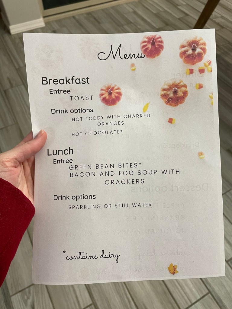 My goal was never to share our family dinner that way and I only thought about it as we began meal preparation. Instead, I wanted this post to be a good follow up to my last message that holidays are not the time to meal shame others for what is on or not on their plate. We did not engage in any daily calorie counting this entire weekend. I had my daughter draft a menu so she could contribute more in line with her interests as she sometimes gets bored cooking and baking with me with some of the tasks being more challenging for her. She decided, on her own, to annotate what was dairy free with one asterisk and put in two to denote items with two asterisks. For an 11 year old, she had a lot of fun putting this together for us.