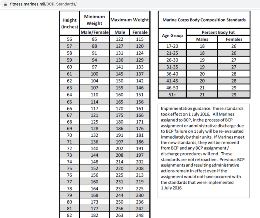 After my first tour in Iraq, one of my earliest weigh-ins was incredibly awkward. My Staff Sergeant was shocked that I weighed about 108 lbs. because my pre-deployment weigh-in was something in the ballpark of 120-125 lbs. and as the only woman on the team, it was easy to feel more visible in the worst way possible. To steal a line from Britney Spears living in American society comes with a feeling of always being “She’s too big, now she’s too thin” and body weight management in the Marine Corps is not all that different.