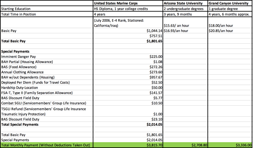 To better highlight my career challenges, I felt it was best to show it from a financial standpoint. I wanted to share one of my highest earning months in the Marine Corps against the rate I received for my ending hourly salaries at ASU and GCU. Can you see now why it felt for a while my graduate degrees (and hell, the undergrad ones, too) felt like a waste of time?!