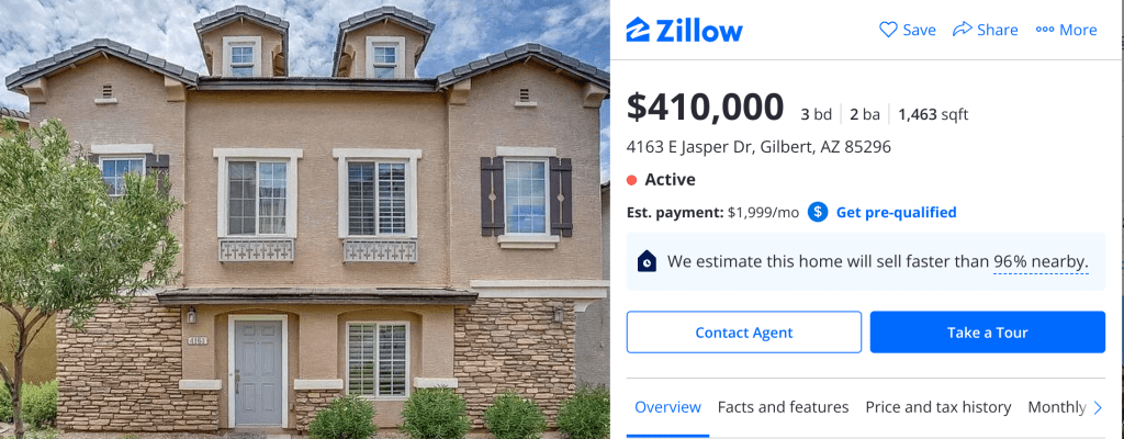 Looking at a similarly priced home to the current The Gardens condo for sale at $410,000, Gilbert also has this home on the market. This one is a bit older than the condo, but the 1998 home instead has a lot size over 6,000 feet for just $15,000 more than the condo. These are the kinds of comparisons confronting us as we went back and forth on whether or not to sell our current home because the sizable profit we could have made was tempting.