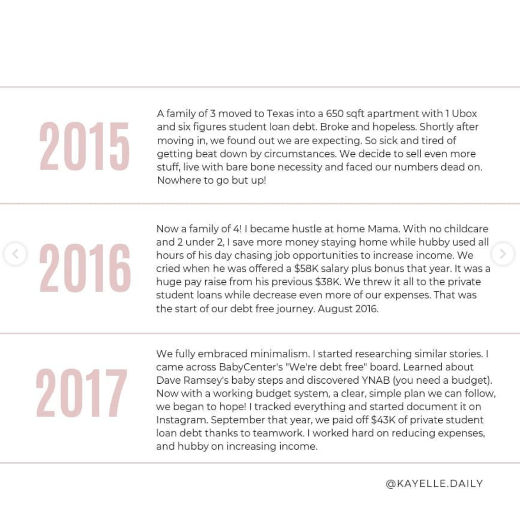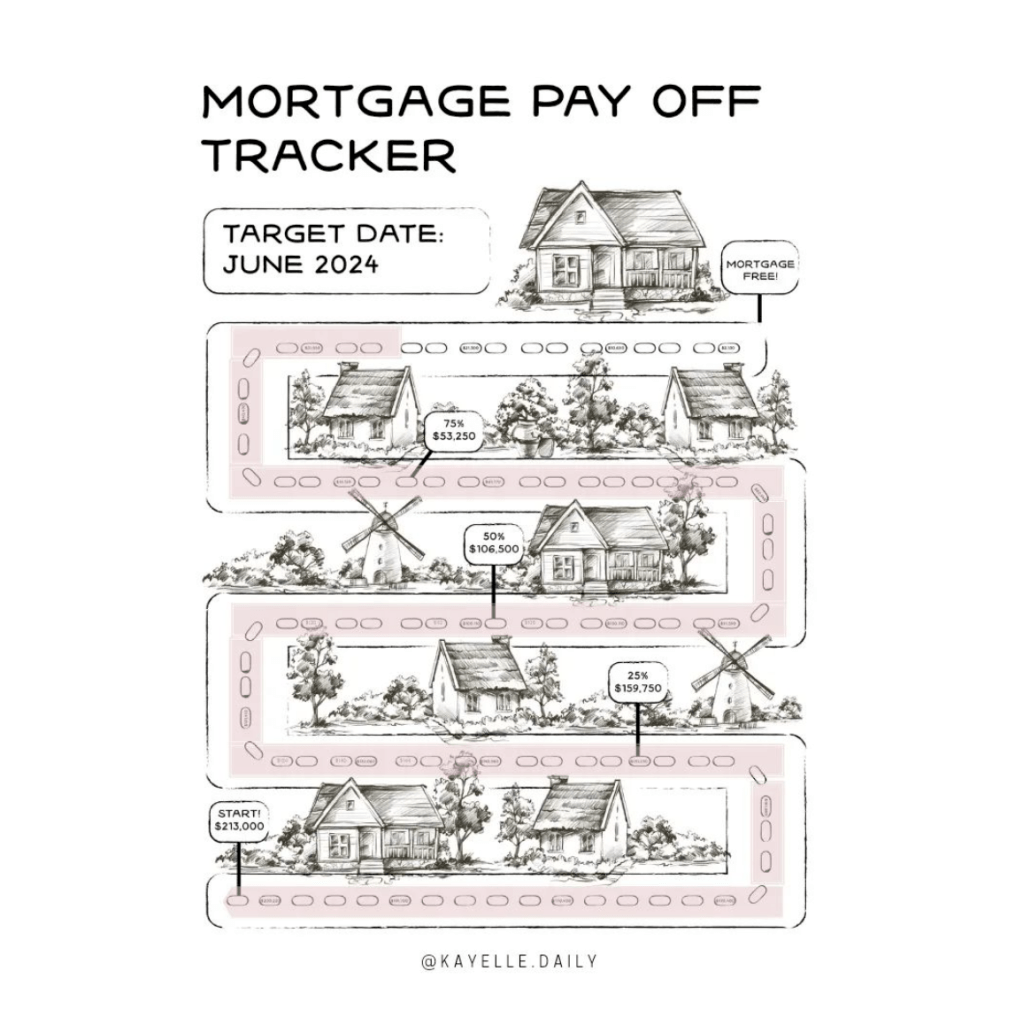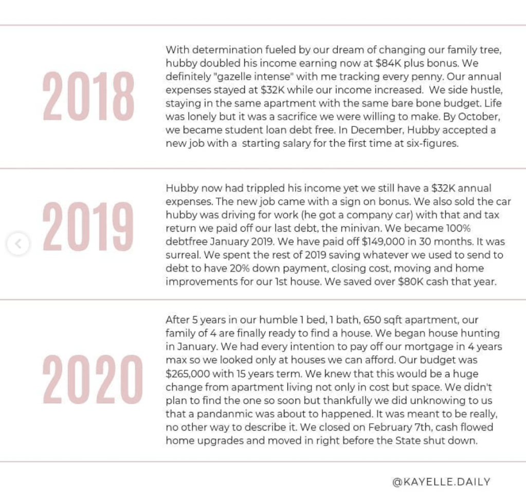 I started to follow @kayelle.daily on Instagram somewhat recently to see her progress as a six-figure single income household during her mortgage payoff and while she describes herself as “work optional” based on her husband’s job, I understand that type of journey is not right for me. I can jump onboard with the idea of paying down the mortgage, but I don’t want to stay at home full time as a mother. When I first found this account on Instagram, I will admit I was a bit overwhelmed. Her page was beautiful, but I was looking for an explanation of how she got to where she is today.